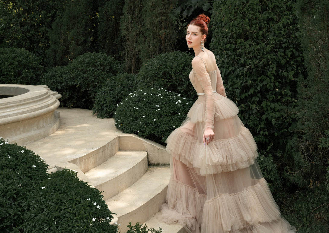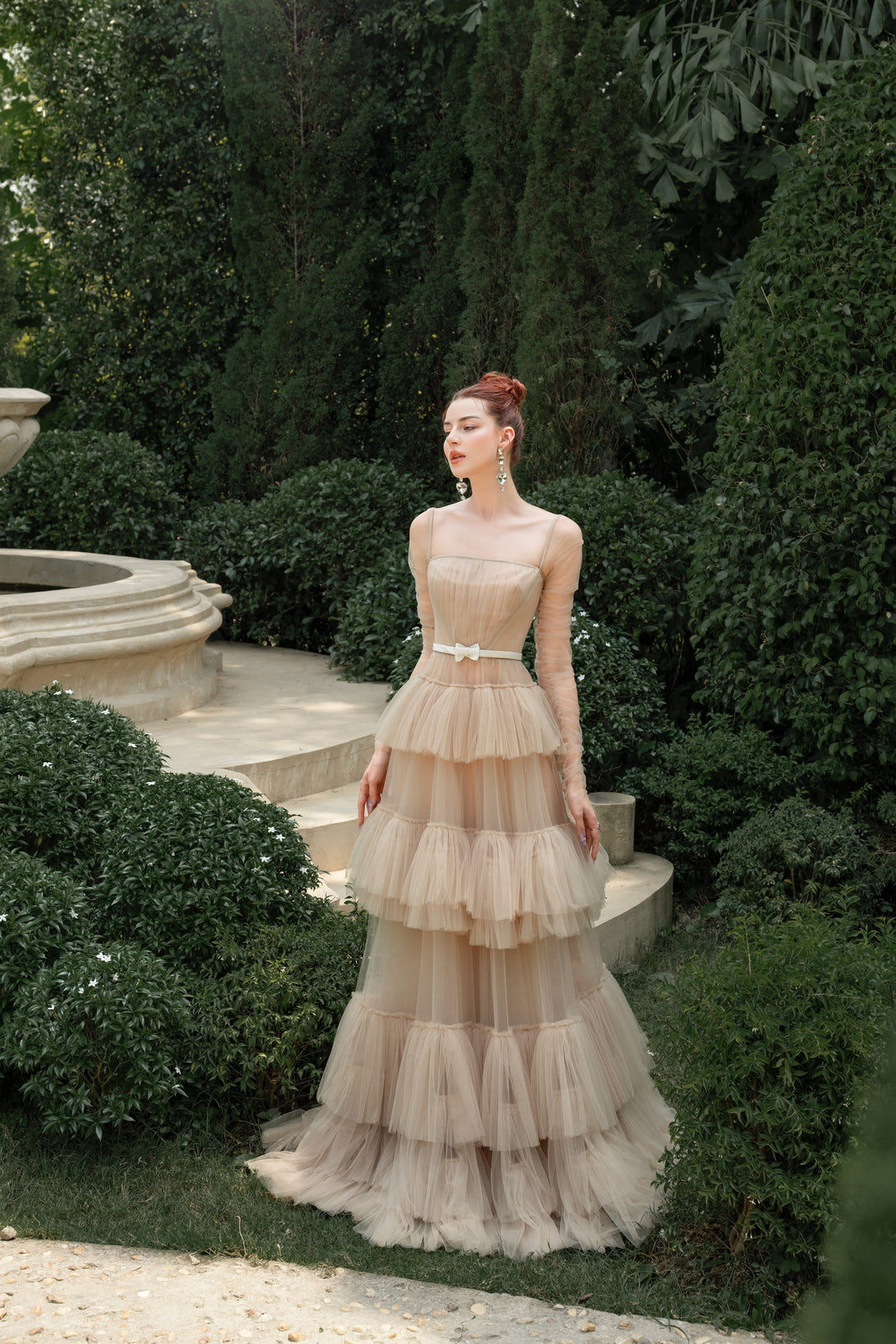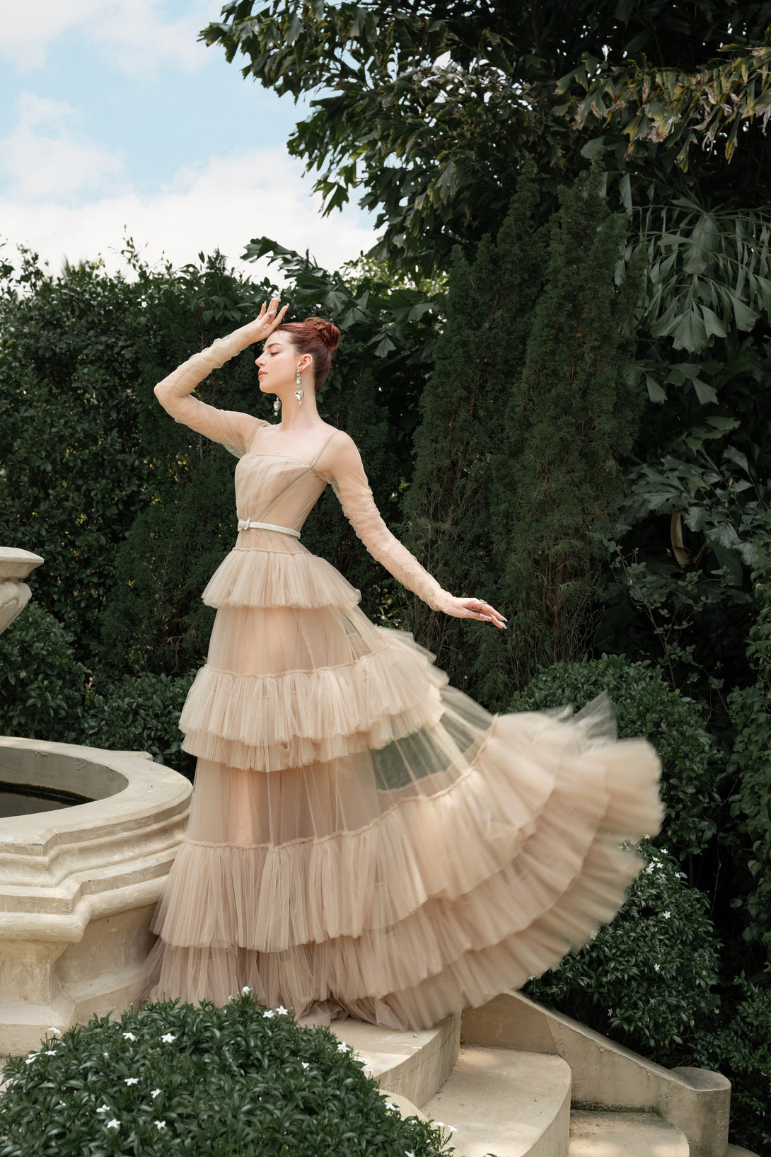 Ethereal Aura Dress - signature dress combined with many meticulous handcrafted methods, the mesh layer is folded by hand in the most meticulous way. Bringing spring into the mind of the muse Calista. The spirit of lightness, joy, and freedom is tied with a pure, graceful white bow as an emotional touch.