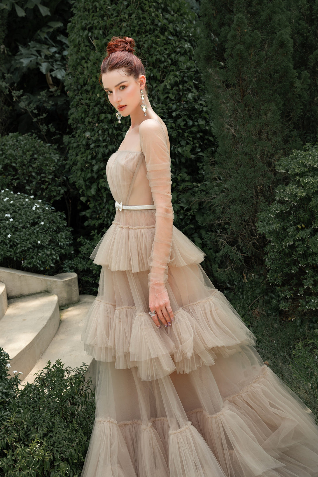 ETHEREAL Aura Square Neck Long Sleeve Tulle Dress
