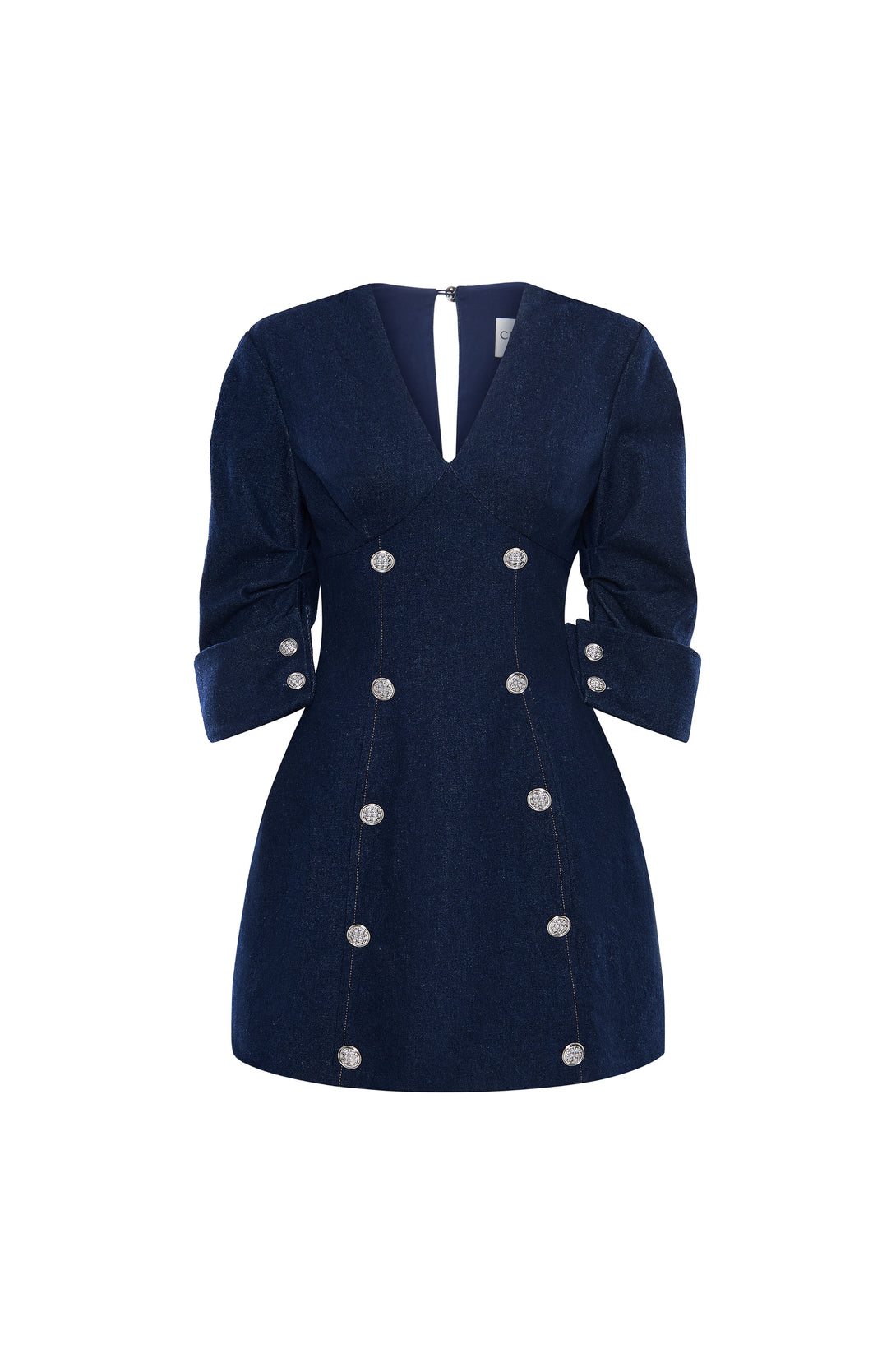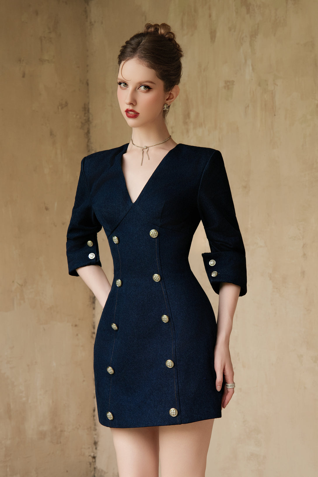 A tailored denim mini dress with gold buttons and structured 3/4 sleeves, combining sharp elegance with modern femininity.