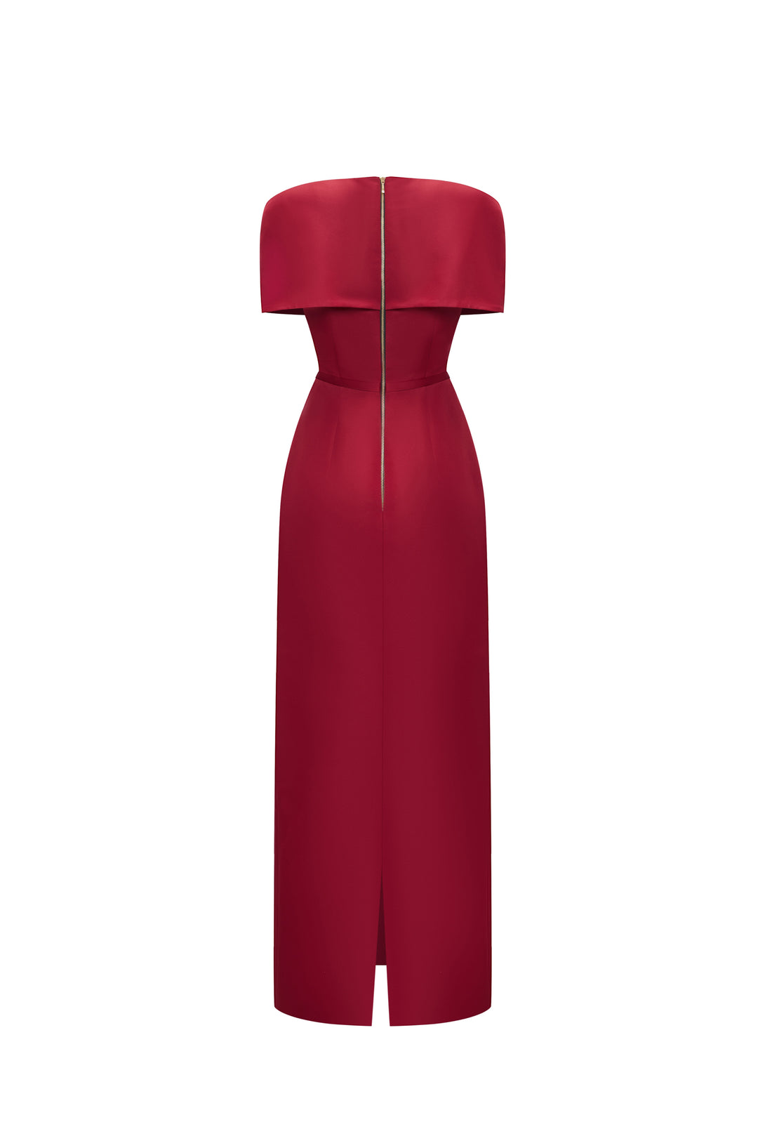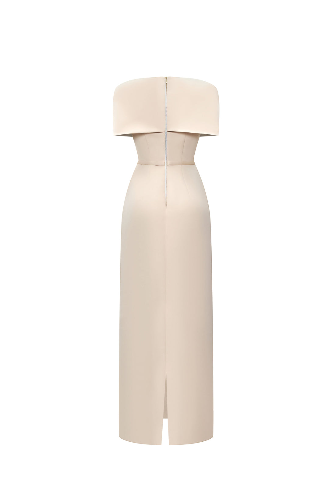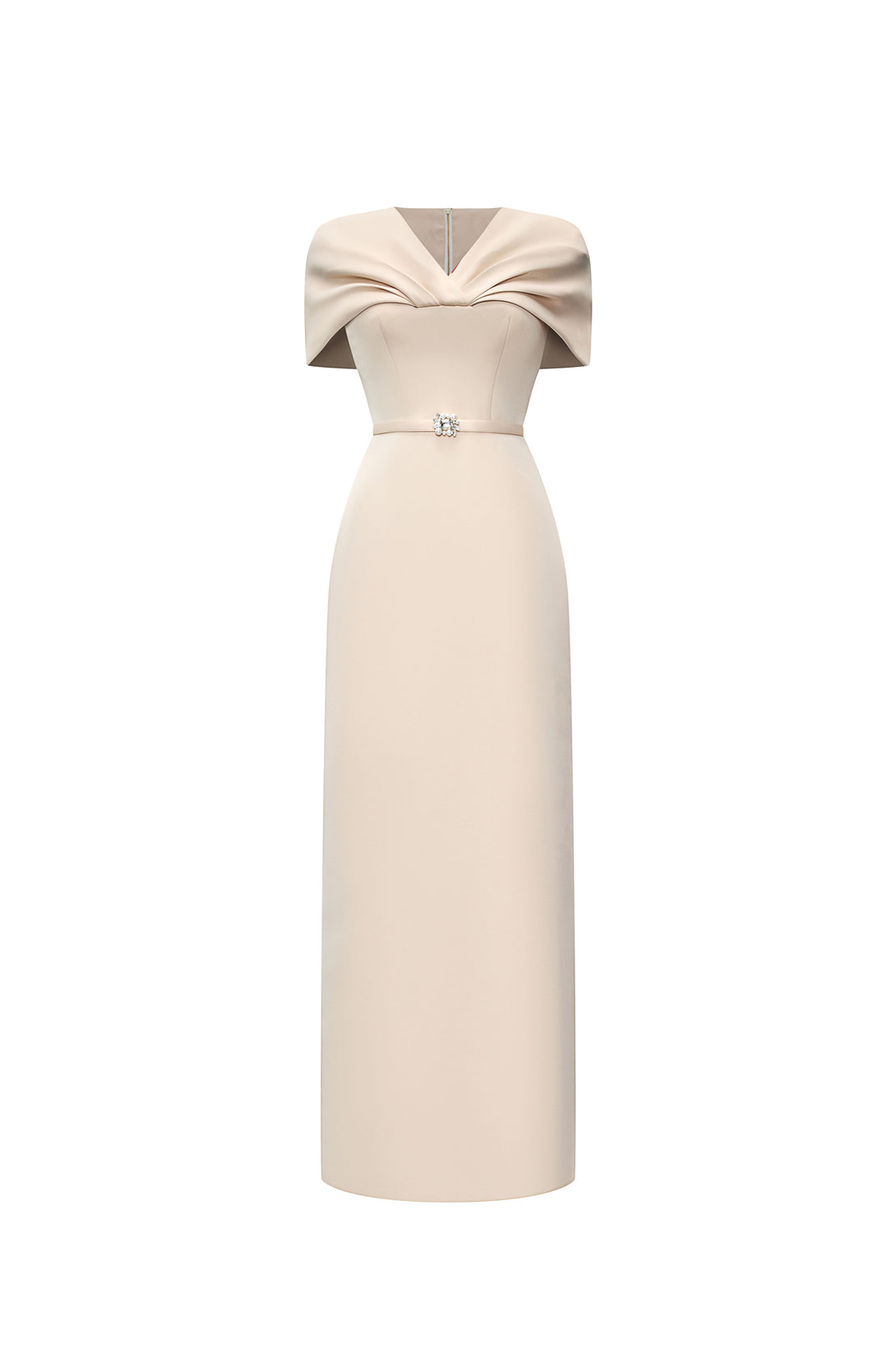 A refined evening dress with sculpted shoulders and a crystal belt accent, blending minimalist elegance with modern sophistication.