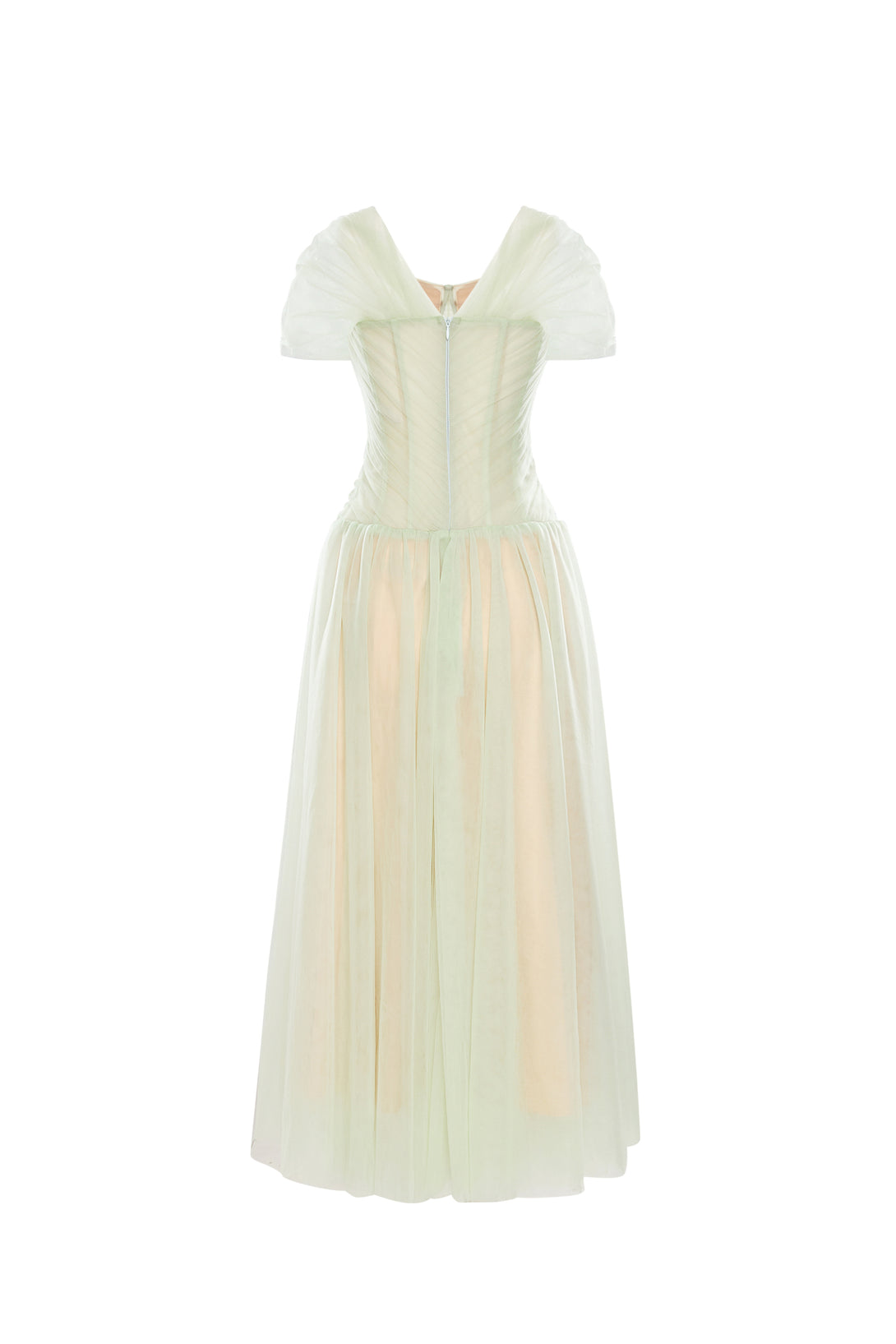 A corset mini dress in luxurious mesh with layered sleeves, pleated bust, and hand embellishment — timelessly feminine with luminous detail.