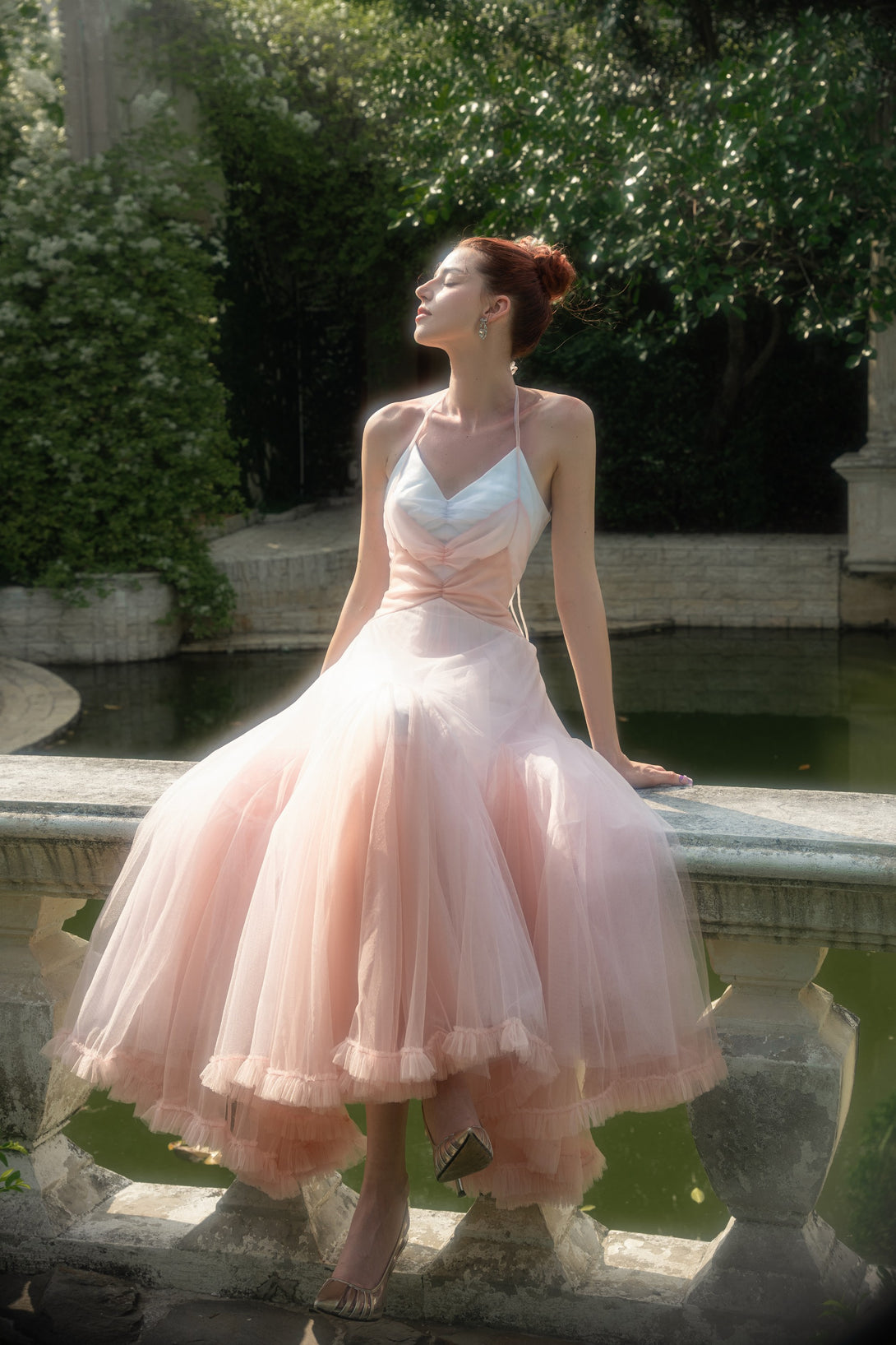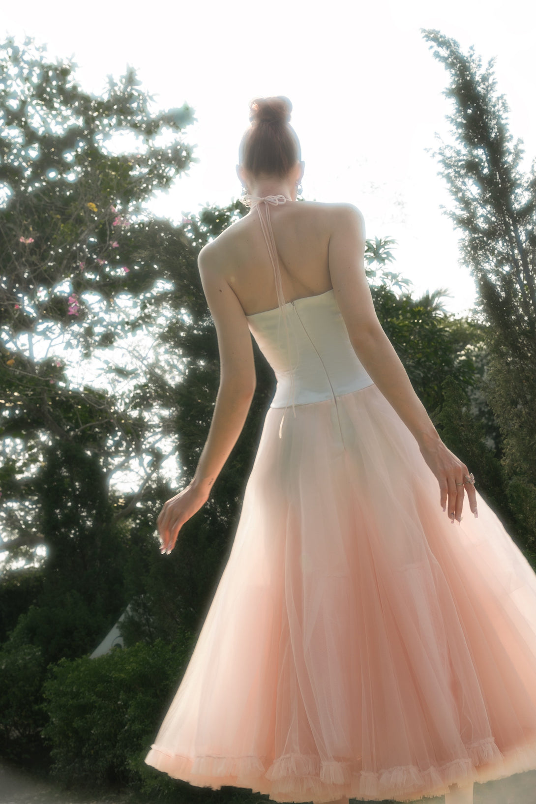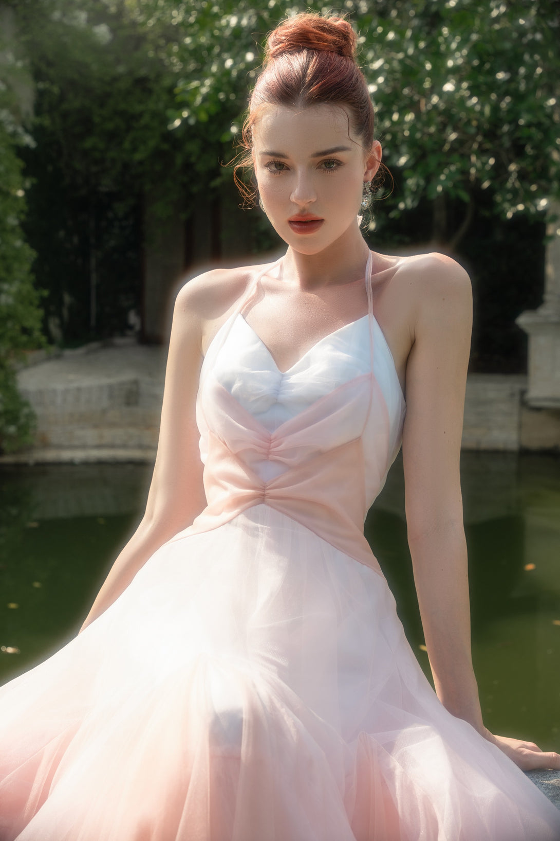 Rêverie Pastel Dress is the design that Calista shows off her skillful technique of sewing and mixing colorful fabrics, with the highlight of the front body being fluffed and combined into a bow on high-quality tulle material.