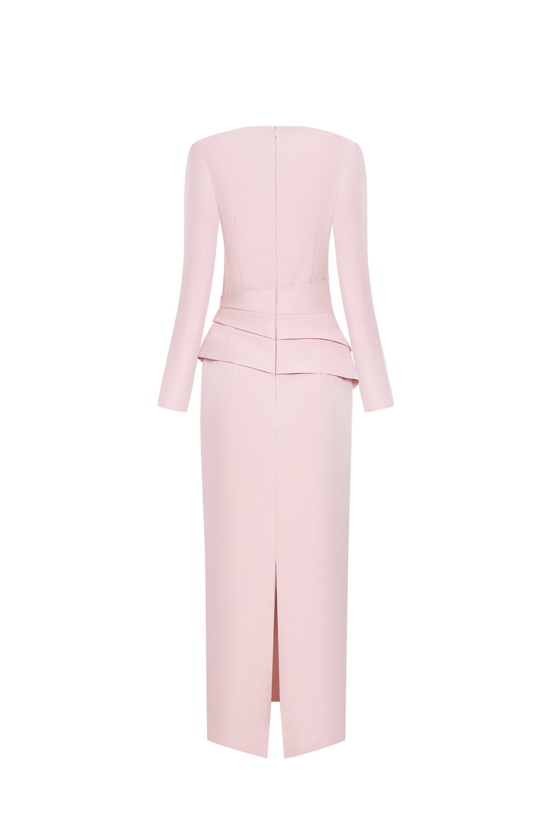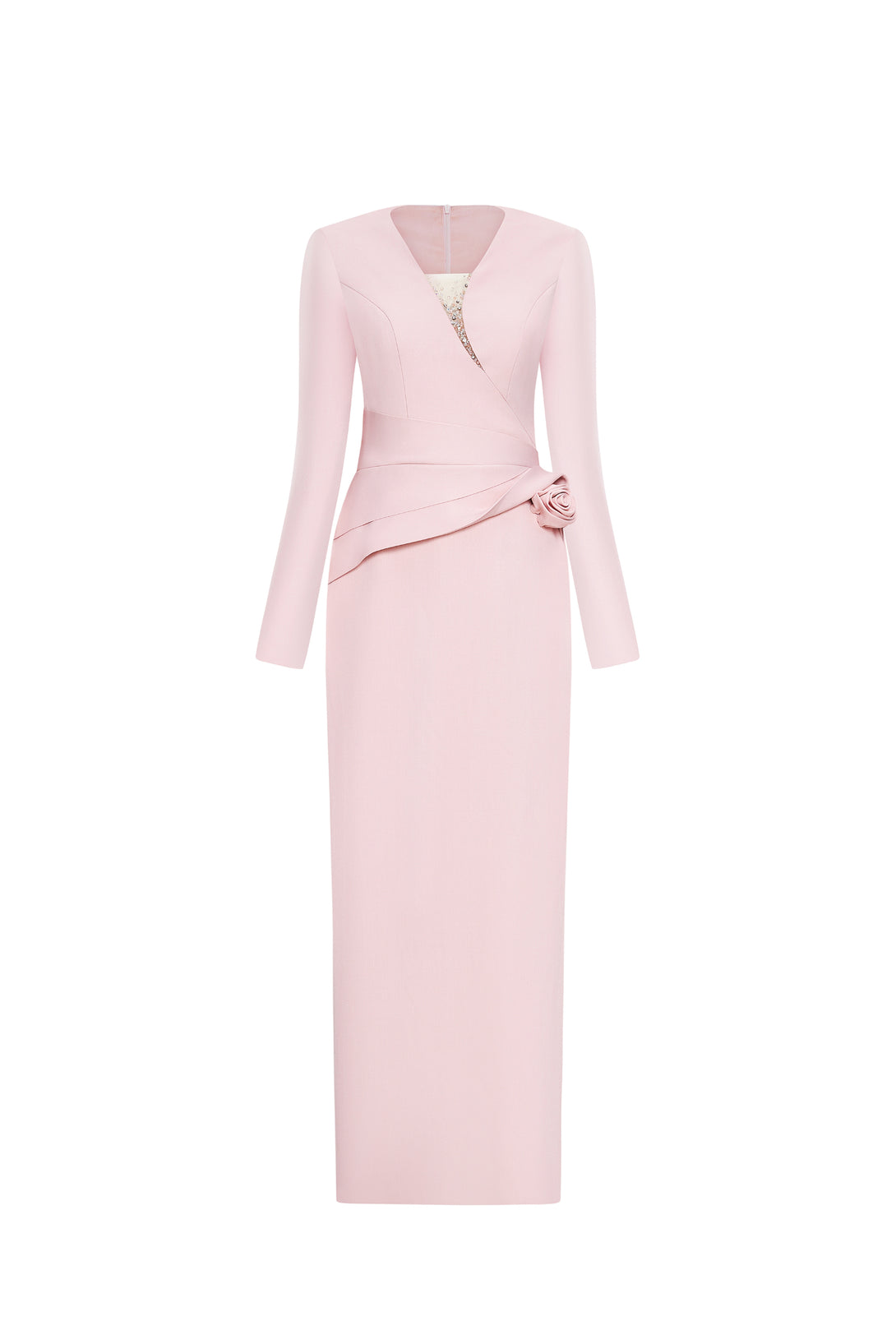 A blush pink gown with draped waist rose detail and deep V-neckline, designed for timeless elegance.